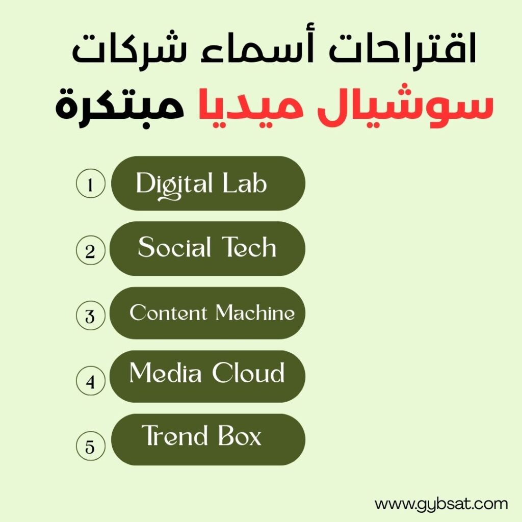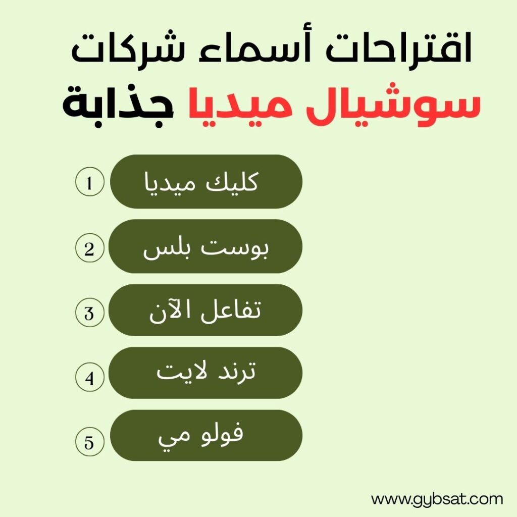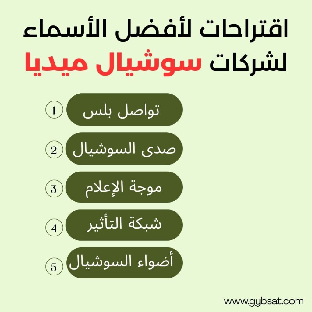 من أفضل أسماء شركات السوشيال ميديا: ترند، سوشيال بلس، ديجيتال موجة، سبوت لايت، نمو، تفاعل، كليك، براند بوست، إنفلوانس، فيرال، بوست أب، ميديا لاين، جروث هَب، سمارت سوشيال، فيجن ميديا، نيوترندز، كنكت، ديجيتال سبارك، رفعة، تسويق، أونلاين، إبداع، تأثير، انتشار.