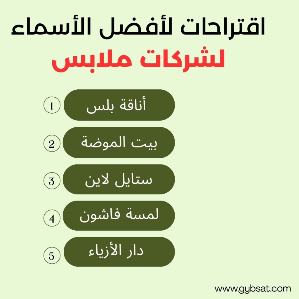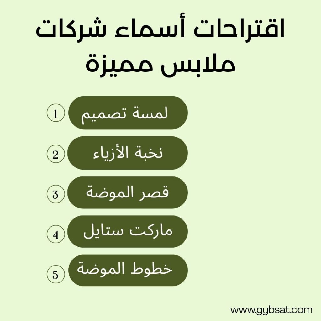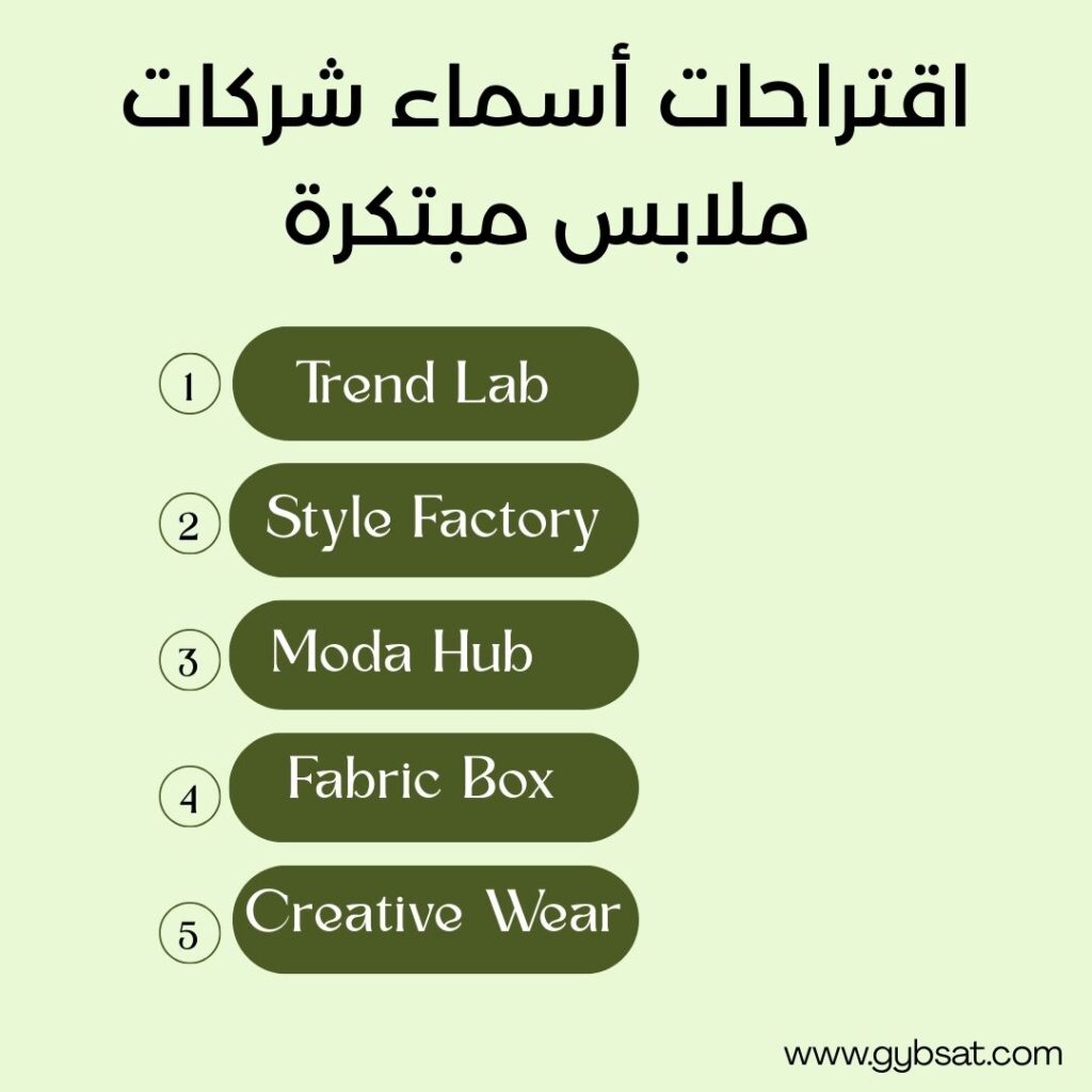 أفضل أسماء شركات الملابس تكون قصيرة، سهلة التذكر، وتعكس الأسلوب: أناقة، لمسة، رونق، ستايلك، Vibe، Nova، Trendify.