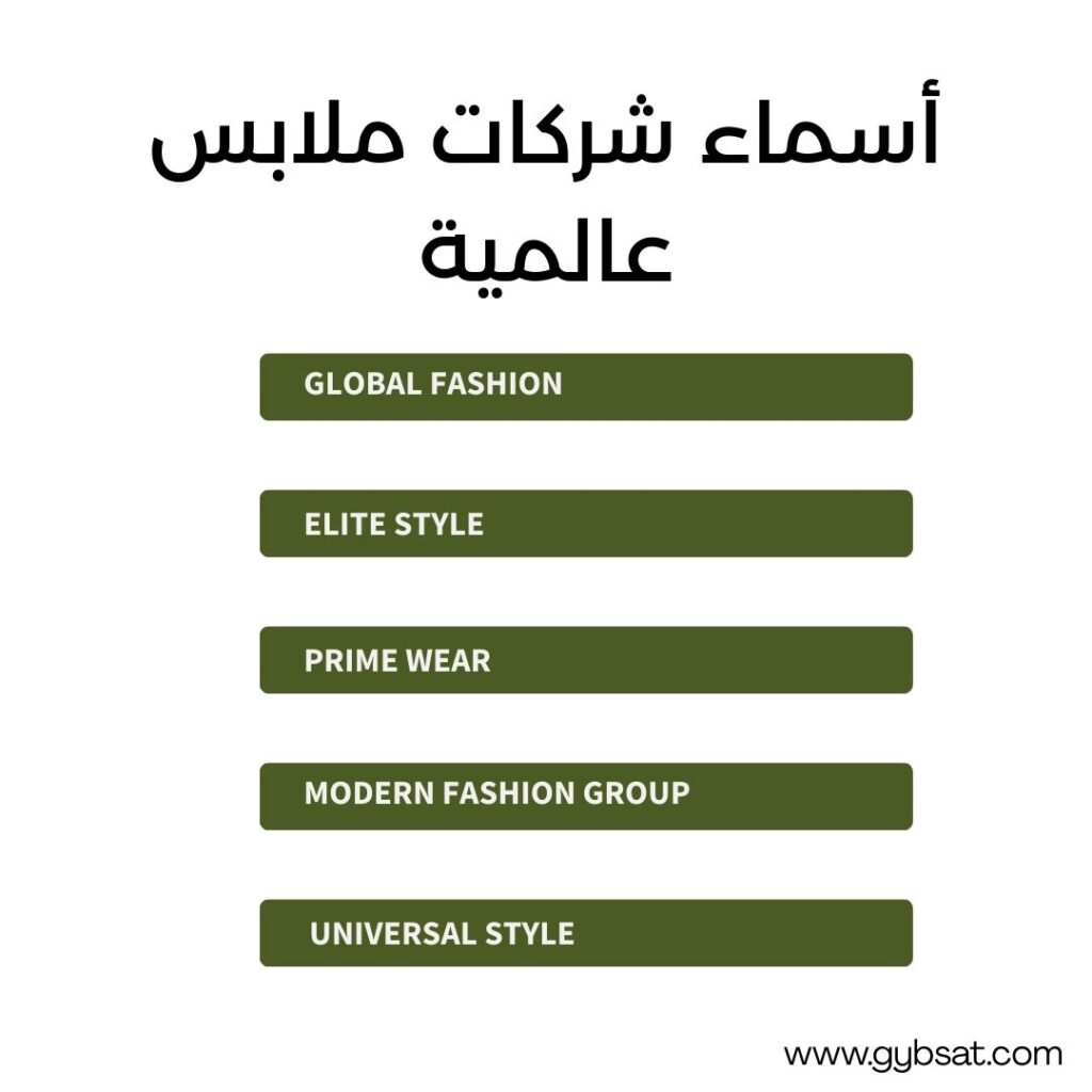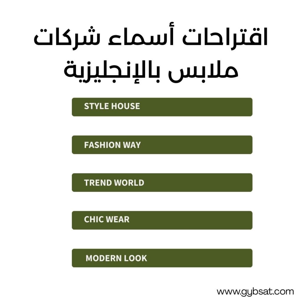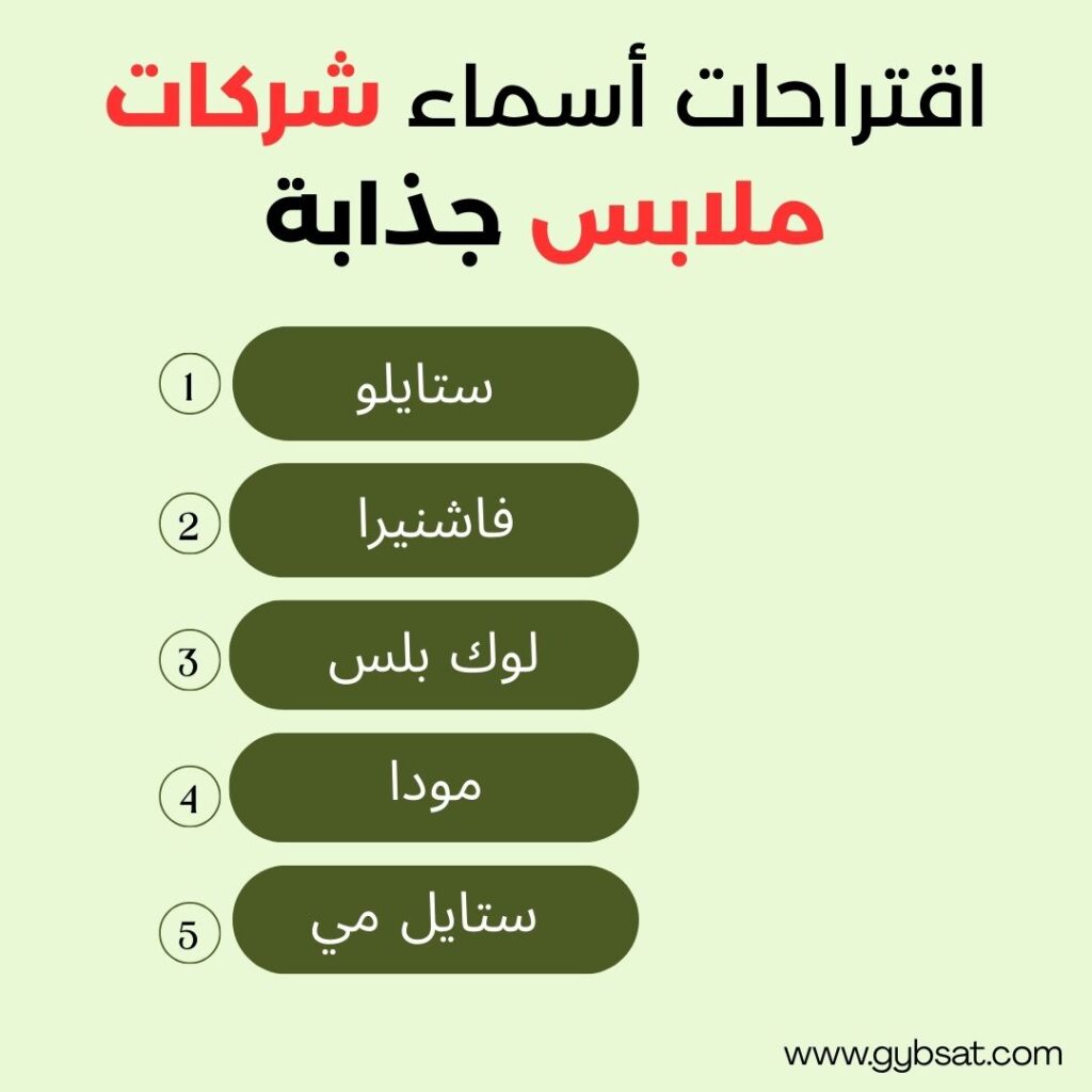 أفضل أسماء شركات الملابس تكون قصيرة، سهلة التذكر، وتعكس الأسلوب: أناقة، لمسة، رونق، ستايلك، Vibe، Nova، Trendify.
