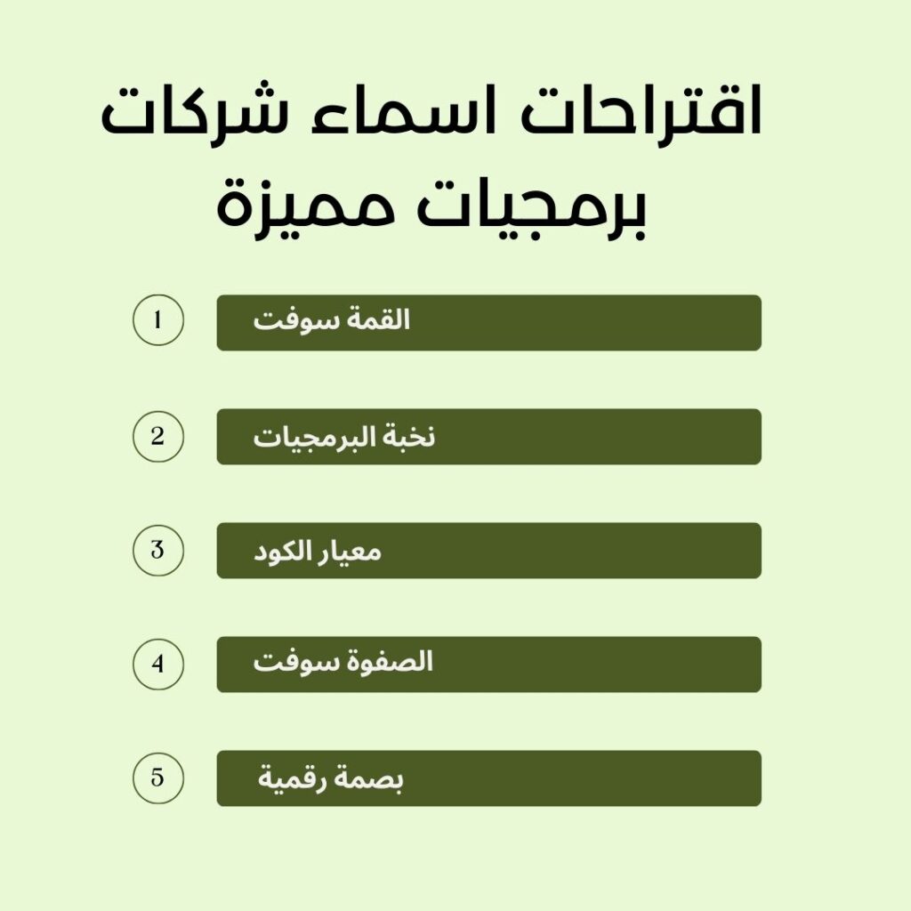 في النهاية اختيار اسم شركة برمجيات خطوة أساسية لبناء مشروع ناجح في سوق تقني تنافسي، ومع القوائم والمعايير اللي اتعرضت في المقال تقدر تختار اسم يعبر عن القوة التقنية والابتكار، ويكون أساس متين لبناء علامة تجارية قادرة على النمو والانتشار بثقة.